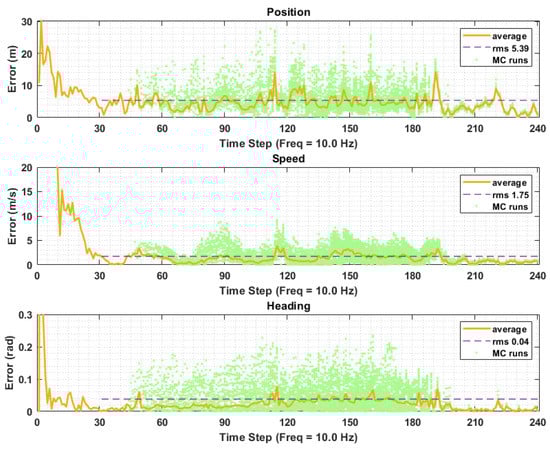 At the top of Figure 6, the average estimation error of the position is shown, and the RMS of the average error value is 5.39 m. The average estimation error of the speed is shown at the center of the figure, and the RMS of the error was about 1.75 m/s. In the middle, the average estimation error of the heading angles is shown. The RMS value of the error was 0.04 rad. Note that the estimation error was calculated as , and the RMS values were calculated after the steady-state was reached.