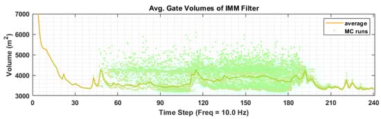 In Figure 7, the average gate volume of the IMM filter is shown. According to these figures, the IMM filter reached the steady-state after 3 s. The guidance algorithm was enabled after 4 s, and at that time, the target was located at (0, 0) with a 180 heading angle. Therefore, the slant range was approximately 10 km when the guidance algorithm was initiated.