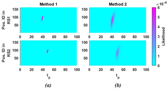 Figure 8 represents the likelihood of the reachable sets’ elements for the two methods as an example. In this figure, the horizontal axis represents the prediction time steps, and the vertical axis represents the position identity of the elements in the reachable set. According to the figure, the covariance of Method 1 was lower than Method 2 in this case. The covariance of Method 1 directly came from the measurement model; therefore, the covariance of Method 1 can be larger than Method 2.