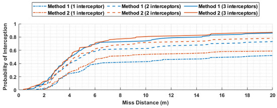 In Figure 10, the probability of interception with respect to the miss distance is given for Method 1 and Method 2 when is 7. In the case that Method 1 is used, the probability of interception is 42%, 62%, and 74%, for the one-to-one, two-to-one, and three-to-one scenarios, respectively. Note that belongs to the one-to-one and and belong to the two-to-one scenarios. For Method 2, the probability of interception is 53%, 71%, and 82% for the same scenarios. These probabilities were calculated in the case of the lethal radius being 10 m. Increasing the number of interceptors improves the probability of interception dramatically. According to the results, knowing the target’s maneuverability limit provides an advantage over Method 1.