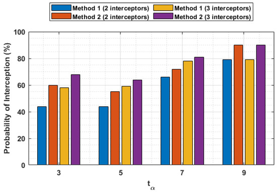 In Figure 13, the probability of interception is shown for different values when the lethal radius is 10 m. When , Method 1 and Method 2 with two interceptors perform similarly. For all values, except , the probability of interception increases as the interceptor number increases. Although Method 1 slightly outperforms Method 2 when , Method 2 provides an overall increase in interception probability.