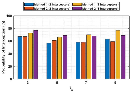 In Figure 11, the probability of interception is shown for different values when the lethal radius is 10 m. When , Method 2 with two interceptors has a higher probability compared to Method 1 with three interceptors, although the number of interceptors is low. When , there is no significant difference between the probability of interception depending on the number of interceptors, although the highest probability was obtained. As increases, the interceptors are launched much later. Hence, an increase in may mean that the interceptors are launched after the target has completed its maneuver, and may not improve the probability.