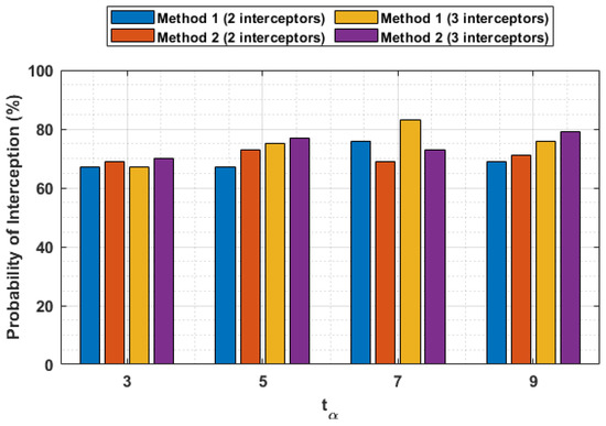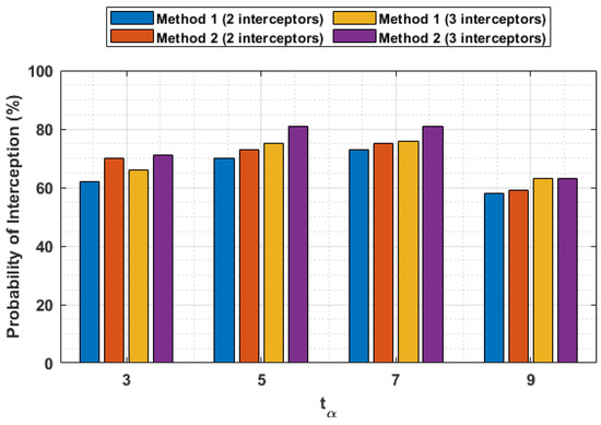 In Figure 12, the probability of interception is shown for different values when the lethal radius is 10 m. When and , Method 1 and Method 2 with two interceptors perform similarly. For all values, the probability of interception increases as the interceptor number increases. When and , Method 1 performs slightly better than Method 2.