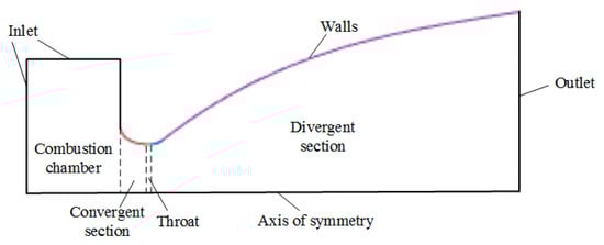 The nozzle is the energy conversion device of the solid rocket motor, which converts the heat energy of high temperature and high-pressure gas into kinetic energy to produce thrust. The profile of the nozzle divergent section affects the gas flow and wall pressure, and is related to motor thrust efficiency [1,2,3]. Particles (mass fraction up to 30%) generated after solid rocket motor propellant combustion cause severe nozzle ablation [3,4], and parameters such as gas temperature and pressure change greatly in the nozzle. The rich flow field characteristics and mechanism are also worth exploring. Nozzle profile design and thermal protection performance should consider motor thrust requirements, thermodynamic characteristics of gas, the external environment, and other factors, all of which are at the forefront of solid rocket motor design. Domestic and foreign scholars have carried out much research in this area.