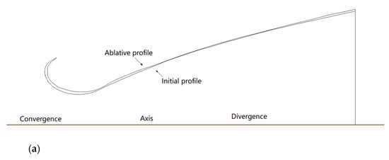 Temperature and pressure of fuel gas in the nozzle are high, and some components may react with the wall, causing thermochemical ablation; the condensed phase particles collide with the wall, causing mechanical erosion of the wall. Ablation changes the nozzle profile, which, in turn, affects gas expansion, flow field structure, and wall temperature and pressure distribution of the nozzle, and affects thrust and other types of performance [15,16]. In this paper, the influence of nozzle profile ablation on its performance is studied through flow field simulation. In view of the profile before and after ablation of a nozzle, the circumferential deviation of the profile ablation rate is not considered. A two-dimensional axisymmetric model is established to simulate the flow field and performance of the nozzle before and after ablation, and to study the influence of axial profile ablation on the motor performance.