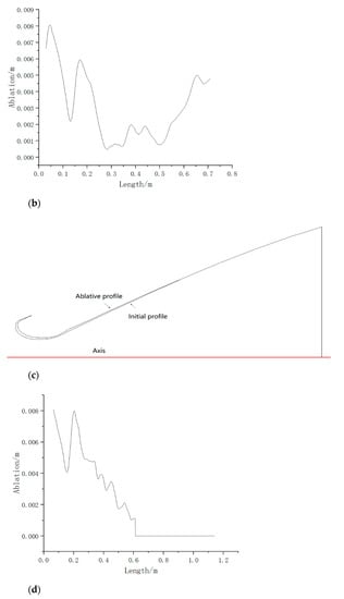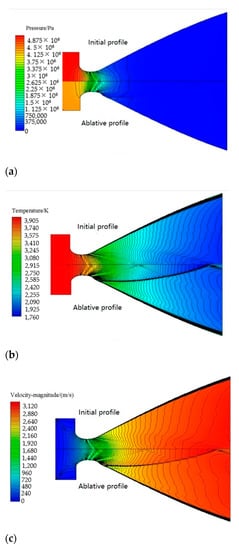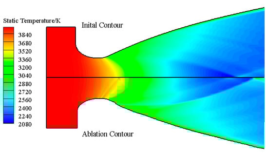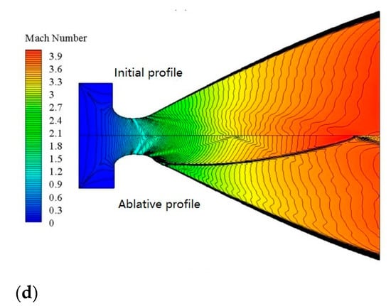 (3) The influence of profile ablation on the flow field temperature in the nozzle was mainly in the expansion section. The numerical change of temperature was opposite to that of the velocity field. The flow field structure, such as internal shock wave, was the same, and the temperature gradient of the flow field in the profile ablation was larger;