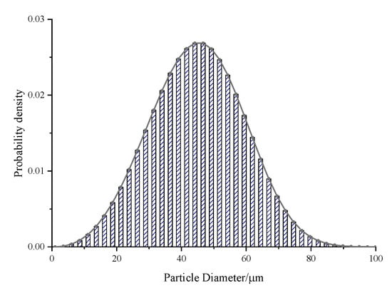 The thermal conductivity of gas is calculated by kinetic energy theory, and the viscosity coefficient is calculated by three-coefficient Sutherland law. The particles of the two-phase flow were inertial particles, whose initial temperature and velocity were the same as those of the inlet fluid. The diameter followed Rosin–Rammler distribution, and the uniformity index was set at 3.5. The maximum, minimum and average diameters were 100 , 1 and 50 , respectively. The probability density distribution of particle diameter is shown in Figure 3.
