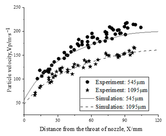The two-phase flow model algorithm and others in the simulation process were consistent with Section 2.3, and the flow field and particle parameter distribution of the nozzle were calculated. The particle velocity distribution on the axis of the nozzle divergent section was extracted as the research object, and comparison with the experimental data is shown in Figure 5. Among them, the dots and five-pointed stars represent the experimental results of particle velocity distribution with diameters of 545 μm and 1095 μm in the original literature, respectively. The solid and dashed lines correspond to the simulation results in this paper, which were in good agreement with each other, verifying the reliability of the model for solving the two-phase flow in the nozzle.