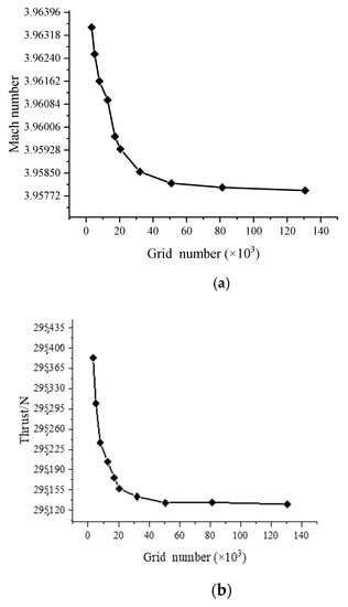 Curve of different parameters changing with grid number: (a) Mach number; (b) thrust.