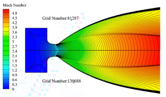 With the increase in the number of grids, the Mach number and thrust at the nozzle outlet location gradually decreased and become stable. When the number of grids exceeded 80,000, the Mach number and thrust changed little, and the flow field distribution of different grids also became quite close (Figure 7 shows the comparison of the Mach number cloud map). Within the allowable range of calculation error, the grid independence of simulation results can be proved. Considering the computational efficiency, the number of subsequent grids was set at about 80,000, which had small errors and good convergence. The adopted grids were all structured grids (the division was complicated, but it was convenient to encrypt specific areas, and the computational convergence speed and accuracy were high), and encrypted near the wall. The grid quality could basically reach 0.98, meeting the simulation requirements.