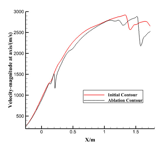 From the distribution of gas axial velocity (Figure 13), it can be seen that after the ablation occurred, at the intersection of the shock wave and the axis, the axial velocity of the flow field decreased in varying degrees because of the changes of shock wave structure in the flow field. Especially near the outlet location, after the ablation occurred, the shock wave strength of flow field was large, and the gas velocity decreased greatly, so the axial velocity at the outlet location was small.