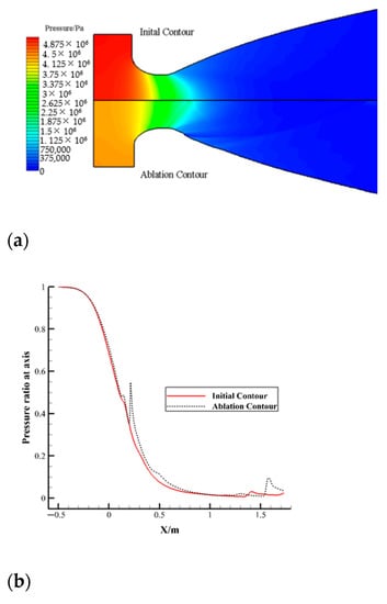 Profile ablation also affects the pressure field of the nozzle, affects the wall force on the nozzle, and further affects the thrust performance of the nozzle. Figure 10a compares the pressure distribution of the nozzle before and after ablation. The impact of profile ablation on the pressure was mainly in the combustion chamber, the nozzle convergent section and the upstream part of the throat. The average pressure difference of the inlet section was 13.68%. The reduction in working pressure led to a reduction in nozzle performance. Figure 10b shows the pressure ratio distribution of the axis before and after ablation of the nozzle. The pressure ratio at the convergent section had little difference. The pressure ratio at the ablation step at the downstream of the throat suddenly increased, then decreased. The pressure ratio at the intersection of the shock wave and the axis near the outlet location increased. The distribution at other locations had slight fluctuations, but the overall difference was not significant.
