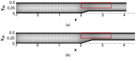 Computational grids for axisymmetric RANS calculations with centerbody radius of (a) and (b) . For clarity, only every other grid line is shown in the y−direction. The red boxes outline the ILES domain.