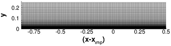Wall-resolved ILES require that the smallest flow structures near the wall are resolved. Computational grids with significantly increased streamwise grid resolution compared to the RANS grids were generated (Figure 4) for a sub-domain of the RANS domain with streamwise and wall-normal extent of and that includes only the primary SBLI. The approach chosen here, which focuses the computational resources on a single SBLI, is frequently employed by the scientific community for detailed investigations of the underlying flow physics (e.g., see Refs. [17,22,41]). The 2D grids were extruded in the azimuthal direction (Figure 5) using the relationships,