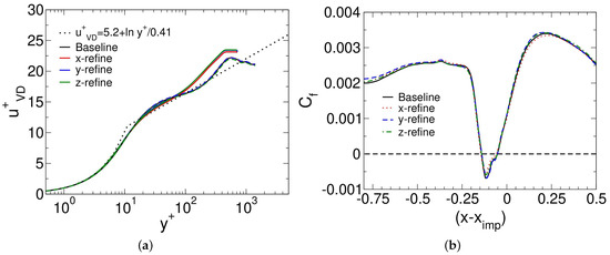 Grid convergence of the ILES was investigated for the case (which has the larger separation) by comparing the results obtained with the baseline grid and the grids with refinement in the x, y, and z directions. Van Driest-transformed velocity profiles at and and skin-friction distributions are provided in Figure 6, where is the shock impingement location. For all three refined meshes, no significant change in the solution is observed compared to the baseline grid. To cut down on the computational expense, all following results are for the baseline grid.