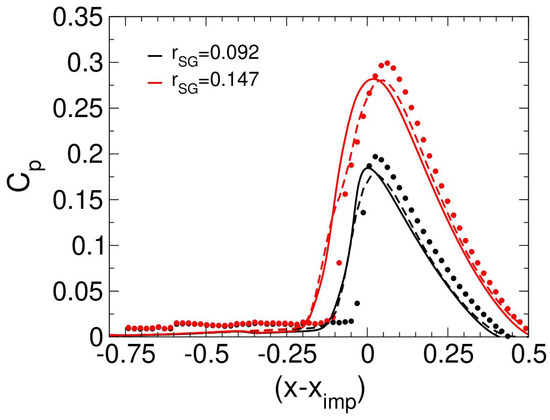 where p is the local dimensionless wall pressure. The maximum wall-pressure coefficient in the interaction region is in good agreement with the experiment. Compared to the experiment, the flow separates earlier in the simulations. This can be attributed to the reduced Reynolds number, which makes the boundary layer less resistant to separation [7]. The expansion fan emanating from the rear end of the conical shock generator causes a pressure recovery which is delayed for the larger shock generator. Very similar pressure coefficient recoveries are observed for the experiments and simulations.