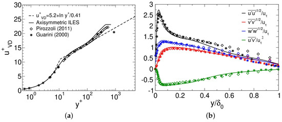 (a) Van Driest-transformed velocity profiles and (b) Reynolds stress profiles at . For (b) solid lines are for the present ILES, diamond symbols (⋄) are for Pirozzoli et al. [51] and star symbols (*) are for Guarini et al. [52].