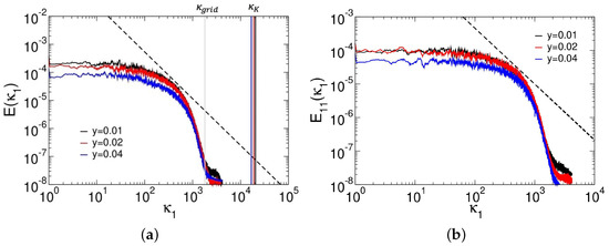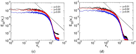 Spectra of (a) TKE, (b) , (c) and (d) for .