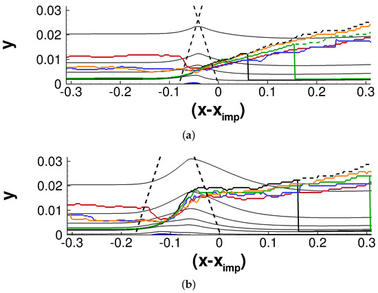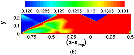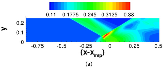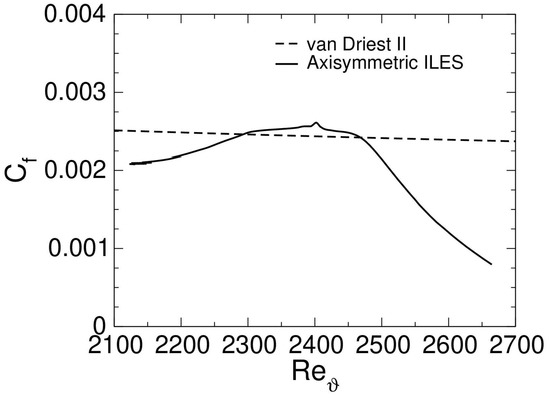 Because of the displacement effect of the boundary layer on the cylindrical test section wall, the freestream Mach number drops slightly ahead of the shock generator to about (see Figure 2). The conical shock generator in the experiment had a half-angle of . To obtain the before and after-shock conditions, the Taylor-Macoll Equation [50] for conical shock waves was solved numerically. In Table 5, “1” indicates the before-shock conditions and “2” indicates the after-shock conditions (right at the shock wave for the analytical solution). Furthermore, included in the same table are the before and after-shock conditions extracted from the mean ILES data slightly upstream and downstream of the shock wave. Compared to the analytical solution, the flow turning is a little larger and the after-shock temperature is minimally higher.