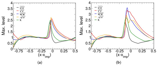 Maximum Reynolds stresses and turbulence kinetic energy for (a) and (b) . Values are normalized by their corresponding upstream value at .