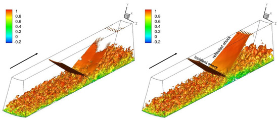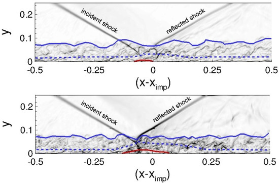 Oblique shock wave and compression ramp SBLIs have been studied for several decades [3,4] and are notorious for their complexity and undesirable characteristics [5]. Some recent SBLI reviews have been provided by Babinsky and Harvey [2] and Smits and Dussauge [6]. When a sufficiently strong shock wave impinges on a turbulent boundary layer, flow separation occurs. Different scaling relationships for the separation length were provided by Souverein [7]. The shock-induced separation region can be subject to large-scale, low-frequency unsteadiness [8,9]. The typically observed range for the low-frequency unsteadiness in both experiments and numerical simulations is [10], where the Strouhal number is based on the separation length and the freestream velocity, . A schematic outline of some of the important features of turbulent SBLIs is provided in Figure 1. Although different explanations for the low-frequency unsteadiness have been proposed, no consensus with regard to its origin has been reached.