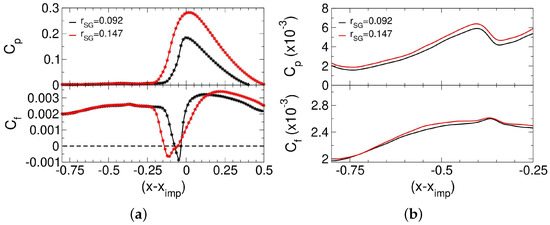 The skin-friction and wall-pressure coefficient computed from the azimuthal and temporal averages are shown in Figure 14. The star symbols represent time averages computed over the first half of the total sampling time. For both cases, the averages computed over the entire and half of the sampling time are identical, proving that the averages are converged. For the larger centerbody, the flow separates sooner and reattaches slightly earlier and the pressure change across the interaction is larger than for the smaller centerbody (Figure 14a). The separation length is defined as the x-interval over which the skin-friction is negative. The approximate separation lengths are for and for . Closer scrutiny of both coefficients upstream of separation (Figure 14b) reveals a weak adverse pressure gradient at that goes hand-in-hand with a small skin-friction increase. This phenomenon is explained by a slight mismatch between the freestream boundary condition (obtained from the 2D RANS solution) and the one-dimensional SEM inflow profile (no wall normal velocity). As a result of the mismatch, a weak pressure wave is formed which impacts the lower wall near (Figure 15b). Compared to the pressure variation across the interaction (Figure 15a), the pressure gradient associated with the wave is marginal (Figure 15b). Given the small magnitude of the effect and the sufficient distance from the interaction (also see Figure 10), this phenomenon is of no consequence for the present investigations.