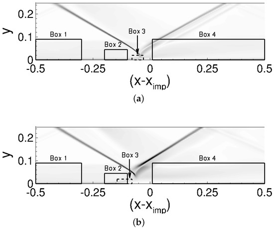 Numerical schlieren images obtained from the temporal and azimuthal averages are presented in Figure 16. Furthermore, included are the box locations for the later POD analysis in Section 3.4. For the larger centerbody, the reflected shock wave is stronger and the density gradients associated with the boundary layer downstream of the interaction are larger. The rarefaction fan originating from the rear end of the conical shock generator is visible as a slightly gray region above the interaction. The inviscid shock impingement location is at approximately for both and .