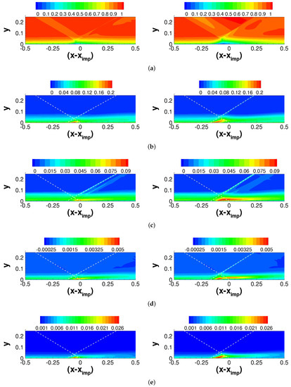 Iso-contours of (a) u, (b) , (c) , (d) and (e) k (temporal and azimuthal averages) for (left) and (right). The dashed white lines indicate the impinging and reflected shock waves.