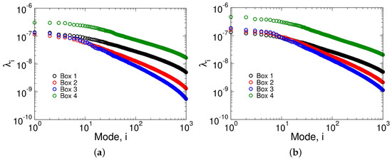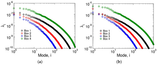 The full 3D data was also analyzed with the POD. The POD eigenvalues computed from the 3D data for the first 1080 modes for and for the first 1280 modes for are presented in Figure 27. Compared to the 2D POD eigenvalues (Figure 21), the drop-off in eigenvalue magnitude towards the higher modes is considerably less for all sub-domains considered. The normalized cumulative POD eigenvalue energy, for the first 1000 modes (excluding mode 0, i.e., the time-average) are presented in Figure 28 for boxes 2 and 3. For both centerbody radii, mode 1 accounts for ≈2–3% of the total energy (), while 60% of is captured by the first 120–220 modes. This slow drop-off in eigenvalue magnitude towards the higher modes is typical for POD of 3D data of turbulent flows.