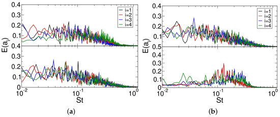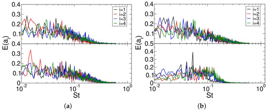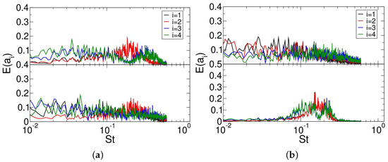 The box 2 spectra, for the smaller centerbody, have peaks at and (mode 2). Furthermore, the peaks centered near and were also observed in the wall-pressure spectra. For , a large peak in the spectrum is present at (mode 3). This peak is also visible in the wall-pressure spectra in Figure 19b. The streamwise elongated regions of low- and high-momentum flow captured by the 3D POD modes for box 2, for the larger centerbody, have a spanwise length scale of approximately consistent with Priebe [18] and Loginov [63].