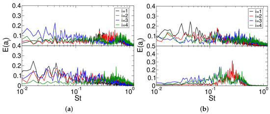 Fourier transforms of 3D POD time coefficients for . (a) Box 1 (top) and box 2 (bottom) and (b) box 3 (top) and box 4 (bottom).