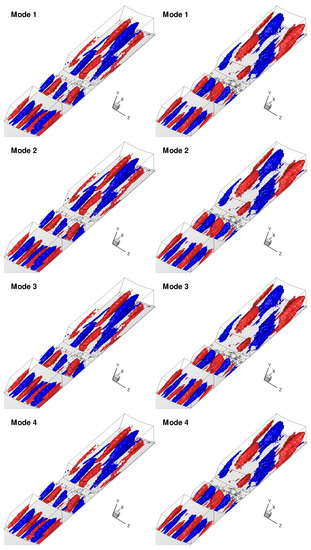 POD modes for (left) and (right). Iso-surfaces of (blue) and (red). Furthermore, included is an instantaneous iso-surface of (gray) obtained directly from the simulation.