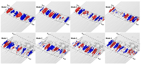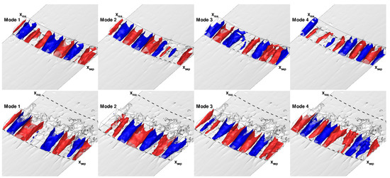 Separated flow region (box 3) POD modes for (top row) and (bottom row). Iso-surfaces of (blue) and (red). Furthermore, included is an instantaneous iso-surface of (gray) obtained directly from the simulation.