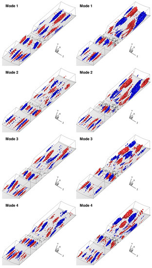 For box 4 (downstream of interaction), the time coefficient spectra have appreciable amplitudes in the range (similar to the 2D POD analysis). Interestingly, the spectra for the smaller centerbody (Figure 29b) appear to be shifted towards a lower Strouhal number range compared to the previous 2D spectra, while the spectra for the larger centerbody (Figure 30b) closely resemble their 2D counterparts. However, different from the 2D POD results, the mode visualizations for box 4 do not reveal the shedding of spanwise coherent structures.