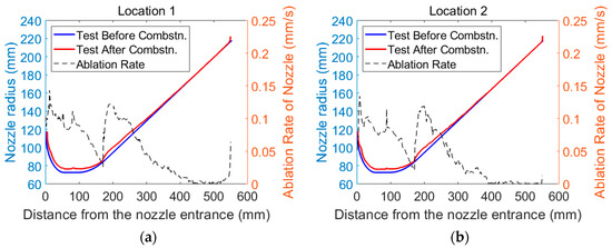 The ablation rates at different positions of the nozzle can be obtained by Equations (1) and (2). Figure 6 shows the contour curve of the ablated nozzle, the design curve, and ablation rates at different locations. The red and blue curves are the contour curves of the ablated nozzle and the design curve, respectively. Additionally, the ordinate is on the left side of figures. The black dotted line is the ablation rate, with ordinate on the right side.