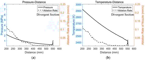 It can be seen from Figure 6 that the ablation rate of the nozzle at the inlet is the most serious, and there is almost no ablation at the end. From the inlet to the end of the nozzle, the ablation rate generally shows a trend from severe to slight. Note that the ablation rate increases sharply at a distance of 200 mm from the nozzle inlet. The throat insert and divergent section are connected here. That is, here is the interface between the two materials.