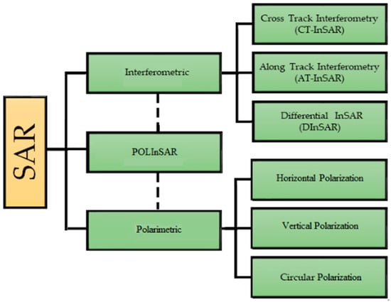 AT-InSAR systems are employed to estimate the radial velocity of targets moving on the ground by combining the interferometric phases, which are acquired by combining the two intricate SAR images obtained by two antennas spatially separated along the platform moving direction []. The AT-InSAR can be used in various applications such as monitoring real-time traffic management, ocean currents, coastal surveillance, ice drift, etc. In AT-InSAR, the baseline difference is an along-track distance, with a magnitude depending on the mission type, and determines the time difference associated with the pass of the satellite over the particular target, hence measured in seconds for single pass interferometry (two consecutive satellites looking at the same target) or days/years for multiple-pass interferometry (i.e., to process a stack of images taken on different passes over the same scene by the same satellite, other different satellites in a SAR constellation). Figure 4 shows different types of SAR in a simplified classification. The two main branches, interferometric and polarimetric, can also be combined as in the polarimetric SAR interferometry (POLInSAR) techniques [].