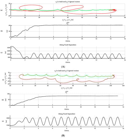 Notice that the difference between the followers also preserves the relative eccentricity and relative inclinations vectors as collinear, therefore achieving a safe condition. This formation can include more followers by adding other scales on the same axis, preserving the collinearity between the relative eccentricity and inclination vectors for the given follower. On the other hand, different along-track baselines could be chosen for each of these followers. As the chief orbit is sun-synchronous and frozen, the satellite altitude and relative orbit baselines are guaranteed to repeat for the same latitude; hence the interferogram products generated on each pass have geometric coherence between different passes, enabling to perform differential interferometry by taking a set of images generated by the SAR system for the same zone. Moreover, the multiple along-track channels make it possible to track different velocity ranges for the targets on the Earth’s surface, see [], which can also be compared along the same pass by adding followers with different along-track baselines with the safe configuration previously presented. The following equation, adapted from [] (Equation (1)), defines a metric to evaluate the minimum distance, on the radial/normal plane, between two satellites in a formation, by using the Relative Orbital Elements, as follows, for a chief orbit with semi-major axis :