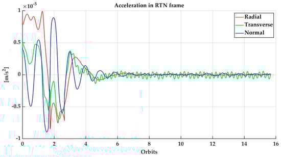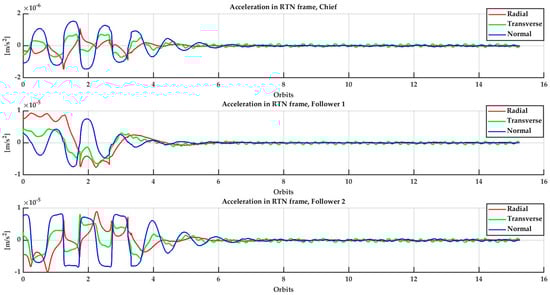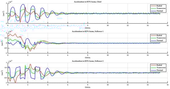 Figure 11 and Figure 12 show the control acceleration evolution to implement the same formation reconfiguration as proposed for AT-InSAR, with and respectively. It is a verified fact that for a larger value of , the control authority required on the chief becomes reduced in comparison with the followers’. This also has an impact on the DeltaV of each satellite, as shown in Figure 13. This could be taken for a trade-off on the specific constellation/formation system design under the particular restrictions and mission objectives, which is beyond the scope of this work.