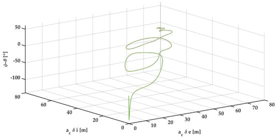 Figure 8 shows the result for follower 1 with an orbit control period of 20 s, and assuming here ideal orbit navigation. For a satellite mass of 100 kg, the simulated thrust bound would be 1 mN in all directions. Figure 9 shows the coordinates given by the difference between relative perigee angle and relative ascending node angle , with respect to the norms of the relative eccentricity and relative inclination vectors, scaled by the chief’s semi-major axis []. Notice that the beginning of the trajectory is at the origin of and , and thus it is not under a safe condition, while at the end, the difference is nearly zero (i.e., the relative eccentricity and inclination vectors are collinear) while the stationary relative eccentricity and inclination norms are approximately 40 m when scaled by the semi-major axis. Therefore, the reconfiguration achieves the desired baseline and the required safe condition.