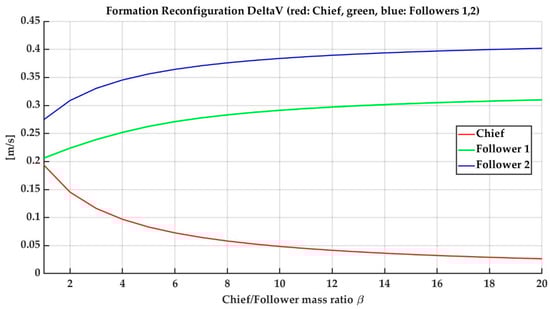 In the studies of a companion satellite for the L-band SAR Argentine MicroWave Observation Satellite: Satélite Argentino de Observación COn Microondas (SAOCOM) mission [,], the relation of masses between the chief and the follower was around ten times. It is reasonable to fix the same mass for the followers, i.e., , and the chief mass is given as for . Moreover, it would be convenient to implement on the chief a thruster times bigger in terms of force and propellant mass, for a given common propulsion technology and specific impulse. Under this mass model, the total mass of the constellation of formation would be , where . is the number of formations of three satellites (one chief and two followers). The following particular cases can be identified by inspection of Equations (12)–(14):