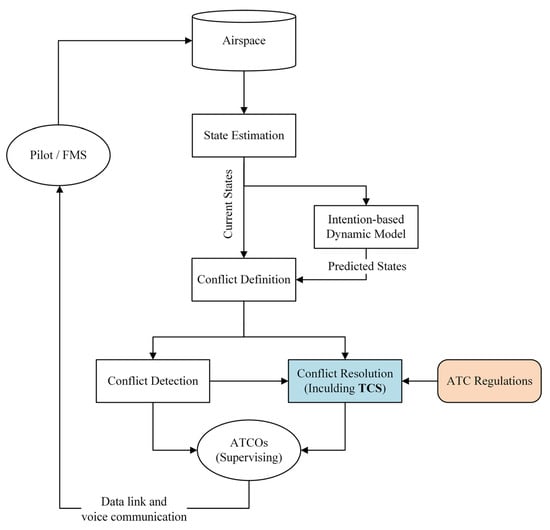 Based on the CD&R framework for assisting ATCOs’ decision-making proposed by Kuchar et al. [], relevant modules are refined, as shown in Figure 1. The state estimation module observes the airspace and obtains an estimate of the current traffic situation, which is then passed to the intention-based dynamic model to estimate the future state of the airspace. The conflict detection module generates conflict information based on conflict definitions. The conflict resolution module generates CR instructions based on ATC regulations.