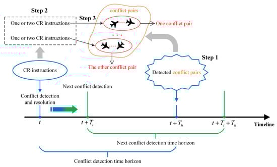 - Step 2: Conflict resolution. One or two CR instructions are generated for each conflict pair in turn at time (if a single CR instruction cannot resolve the conflict pair, two CR instructions are generated for each of the conflicting aircraft to execute).