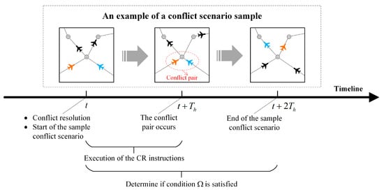 In each CD&R process, there is no conflict during (as conflicts in this time horizon have already been resolved in the previous CD&R process). Therefore, the constructed conflict scenario samples must also satisfy this condition. To improve the efficiency of constructing the samples, the condition for generating an adequate sample is weakened as follows. Consider the case in the square airspace where there exists a conflict pair at , and this conflict pair first occurs during . The two aircraft involved in this conflict pair are not in conflict with the neighbouring aircraft in the airspace during . Subsequently, a conflict scenario sample is resolved when and only when the conflict pair in this sample is resolved.