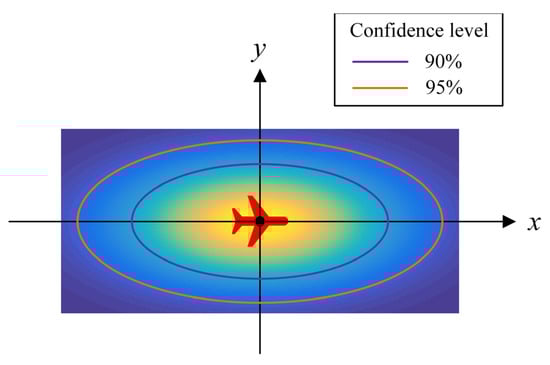 We rely on prediction of the aircraft’s future trajectory to detect conflicts and determine whether the conflict pair has been resolved. However, discrepancies between the actual and predicted trajectories can occur owing to navigation errors and errors in flight technique. In this work, we refer to the model proposed in [] and consider the uncertainty in the real position of the aircraft on the horizontal plane. As shown in Figure 4, a plane rectangular coordinate system is established with the aircraft heading along the positive -axis, with the predicted aircraft position considered as the origin. Assuming that the real horizontal position of the aircraft is the point in the coordinate system, the two-dimensional random variable is subject to the following two-dimensional Gaussian distribution: