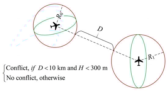 As shown in Figure 4, the confidence ellipse of the two-dimensional Gaussian distribution can be determined according to different confidence levels. Because ellipses are challenging to handle, it is assumed that the real horizontal position of the aircraft does not extend beyond the concentric tangent of the confidence ellipse. The aircraft can self-correct its course, so although the radius of this concentric tangent circle will increase with time, it will not exceed a specific value. This study assumes that the RNAV 1 navigation specification is used and considers this circle to have a maximum radius of 1 nm. The conflict detection mechanism proposed in this study is shown in Figure 5, where the green ellipse is the confidence ellipse, and are the major axis lengths of the two aircraft confidence ellipses, is the vertical separation of the two aircraft, and the confidence level is considered as 90%.