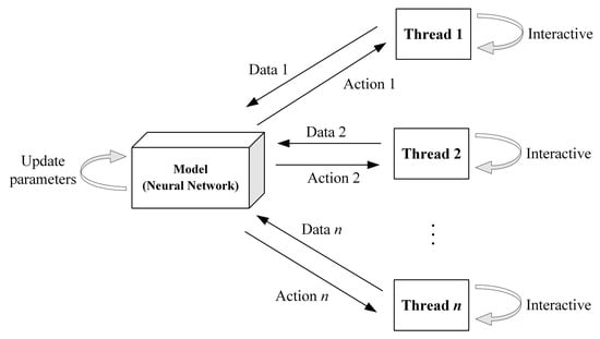 The multithreaded ACKTR is used to train the TCS agent. The agent in each thread interacts with its DRL environment, and the tasks of decision making and training are integrated into the model itself, as shown in Figure 6. in the figure indicates the total number of threads.