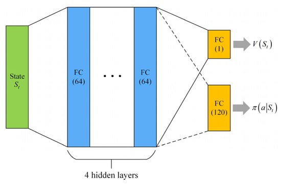 ACKTR uses the actor–critic architecture, which includes a policy network (, i.e., actor) and a value network (, i.e., critic). The output () of the policy network is a distribution; therefore, it is easy to define its Fisher information matrix. However, the output of the standard value network is scalar rather than a distribution; therefore, its Fisher information matrix cannot be defined. Therefore, ACKTR defines the output of the value network as a Gaussian distribution whose can be simply set to 1 in practice. We used the neural network architecture shown in Figure 7 to train the agent. The actor and the critic share a fully connected neural network with four hidden layers each of which connects a fully connected layer to output the value and policy. The numbers in parentheses in the figure represent the number of nodes in the neural network. ‘FC’ represents a fully connected layer.