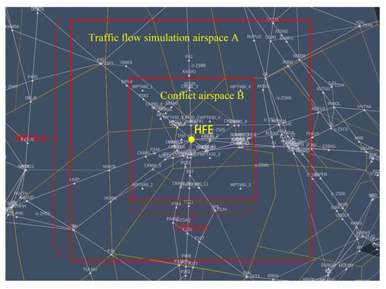 In this paper, a flight conflict is defined as a case in which the horizontal separation between two aircraft is less than 10 km and the vertical separation is less than 300 m at a particular time. The ATC regulations reflect that (1) the CR instructions should be the daily CR instructions used by ATCOs and (2) the CR instructions should adjust the flight state of the aircraft to ensure that parameters such as the speed, rate of climb, and acceleration are consistent with the aircraft dynamics. Therefore, the CR instructions in this study include altitude, speed, and heading adjustments. According to the ICAO document [] and our previous study [], the altitude adjustment is set to 300 m, the speed adjustment is 10 kt, and the heading adjustment is obtained using the route offsets. The offset turning angle is 30°, and the offset distance is 6 nm from the original route.