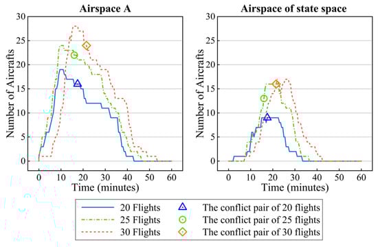 We found that the conflict resolution rate of the testing set decreased as the airspace density increased. The underlying reason is that the airspace structure and traffic flow density determine the size of the available solution space. In practice, to ensure flight safety, airspace density is usually restricted by holding aircraft or controlling traffic flow.